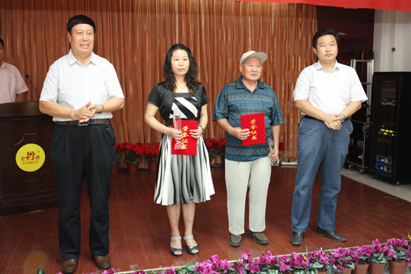 臨沭縣副縣長李真(右一)、董事長高文班(左一)為一等獎(jiǎng)作者頒獎(jiǎng)