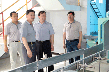 萬(wàn)戰(zhàn)偉(右二)一行在生產(chǎn)現(xiàn)場(chǎng),左二為遂平公司總經(jīng)理王樹善