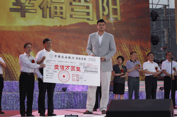董事長高文班(左二)和姚明(左三)共同向湖北省青基會捐贈支票