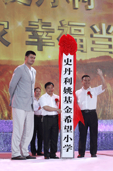 總裁高進華(右一)和姚明(左一)共同為史丹利姚基金當陽希望小學(xué)授牌