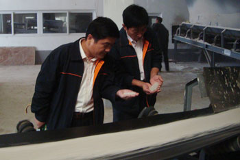 王經(jīng)明經(jīng)理(左)和杜方法經(jīng)理(右)在觀看肥料顆粒